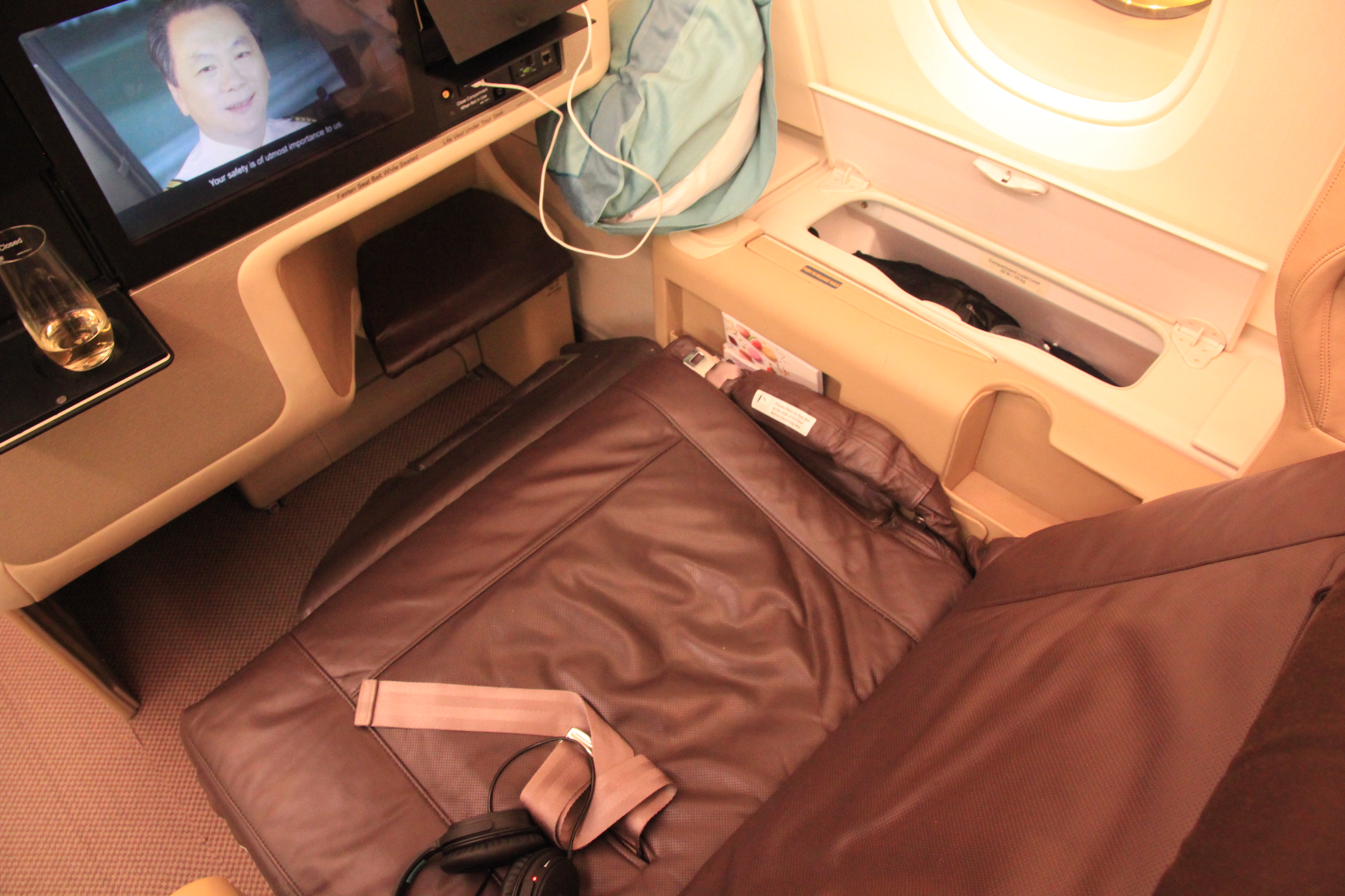 Der Singapore Airlines Business Class Sitz lässt sich natürlich auch in ein komplett flaches Bett verstellen. Hierfür muss man allerdings aufstehen und die Rückenlehne umklappen. Dies ist nicht weiter kompliziert und wird in der Business Class zu Beginn des Fluges in einem Video erklärt. Die Crew hilft hierbei allerdings auch gerne.