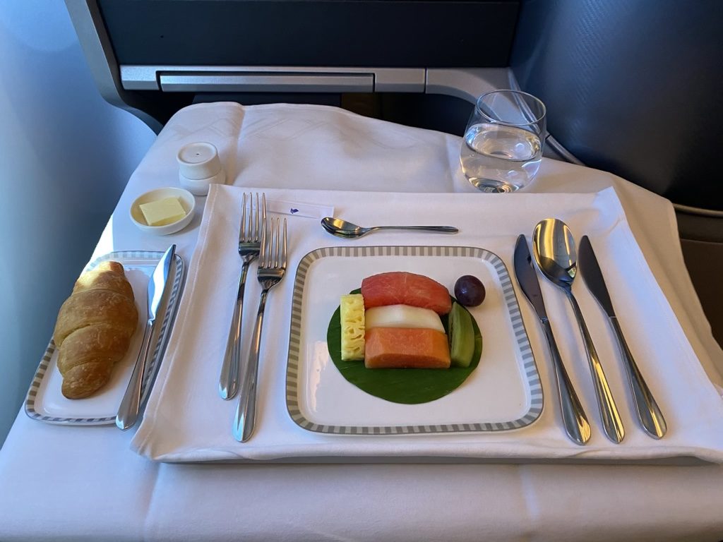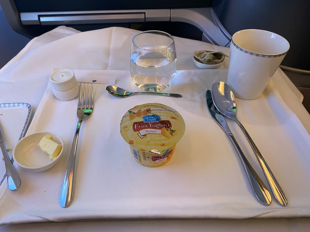 Das Menü stand unter dem Titel Brunch, kein Wunder bei einer Abflugzeit um 9 Uhr morgens. Zu Beginn wurde eine Fruchtplatte serviert, auf welche zeitnah ein Joghurt folgte.