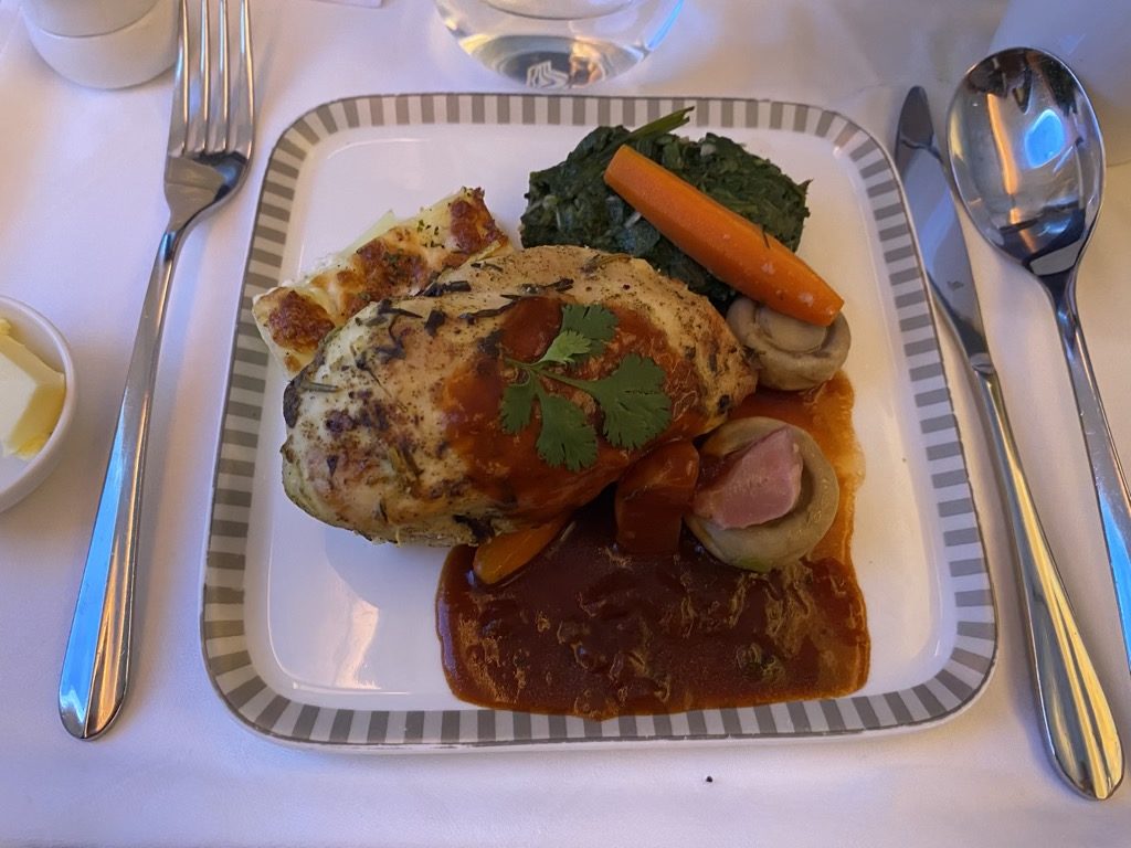 Der Hauptgang stellte sich als gefülltes Hühnchen mit Spinat und Pilzen dar, war für mich jedoch viel zu deftig als Frühstück.