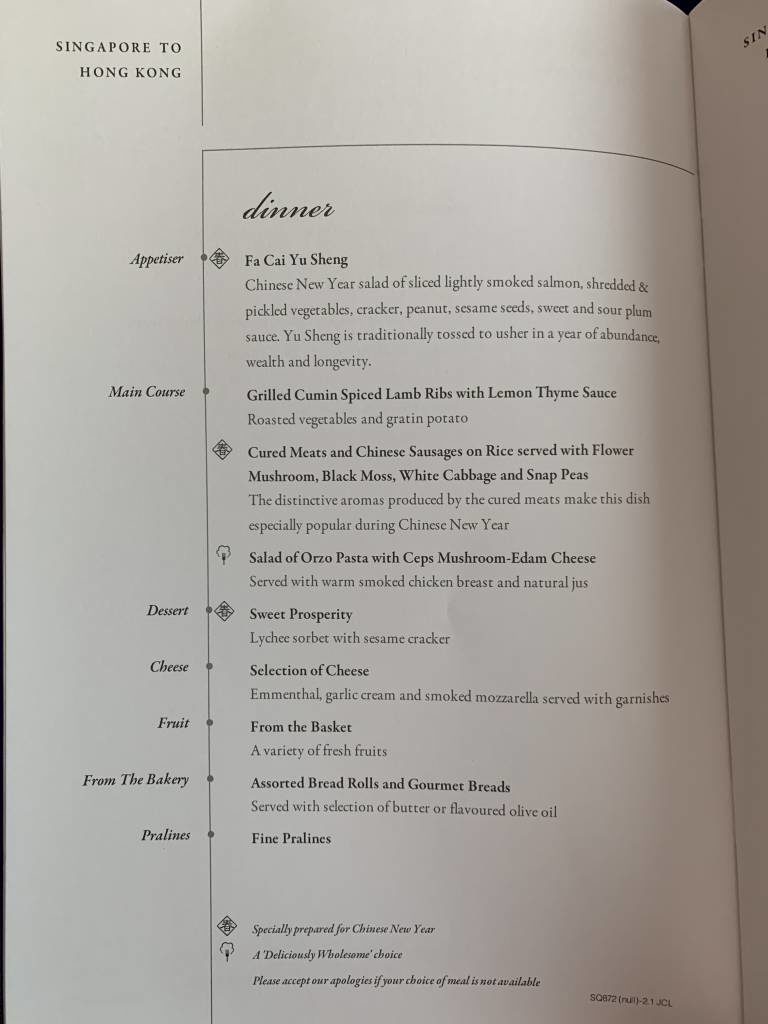 Die Speise- und Getränkekarte vom Flug SQ872: