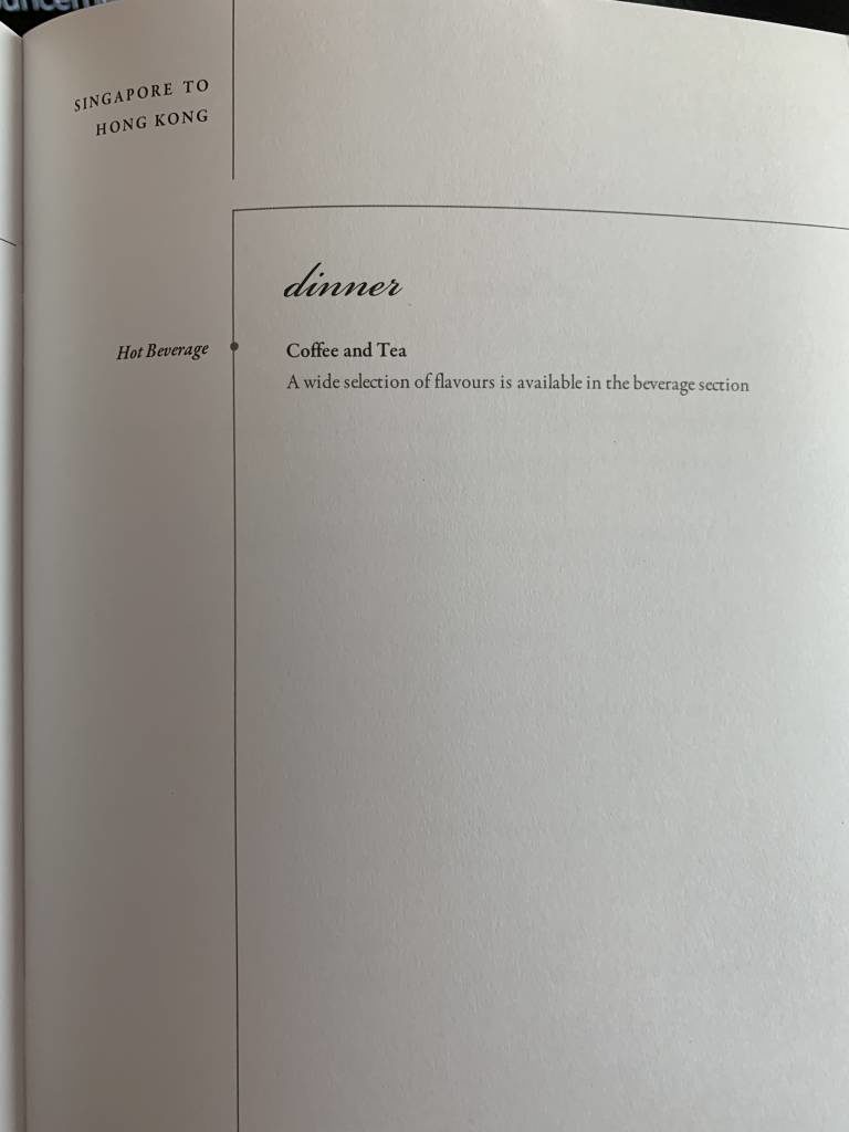 So viel vorweg: Die Getränke-Karte auf einem Singapore Airlines Flug in der Business Class reicht für viele viele Stunden. Ich trinke gerne an Board und probiere möglichst viele alkoholische Getränke. Bei Singapore Airlines könnte ich schon einen kompletten Flug damit verbringen, die Heißgetränke zu testen. Meine Favoriten bisher sind das Malzgetränk Milo, der Oolong Tea und der Kaffee Royal. Die Kaffee- und Teekarte umfasst allein vier Seiten.