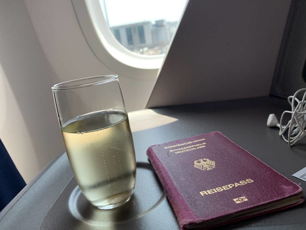 Die Kontrolle klappte dann allerdings recht schnell und über die separate Business Class Bordkarten-Kontrolle konnten wir unmittelbar an Board gehen. Dort wurden wir auch gleich von einer hochmotivierten Crew begrüßt und zu unseren Sitzen begleitet. Natürlich gab es auch wieder ein Gläschen Champagner und die obligatorischen hot towels.