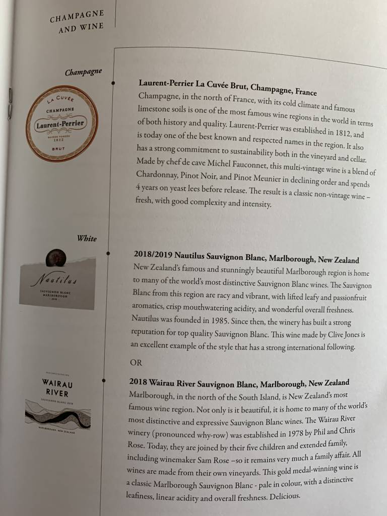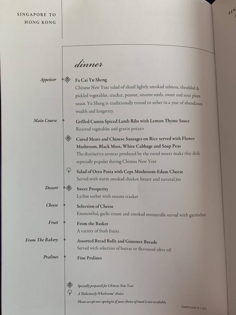 Die Speise- und Getränkekarte vom Flug SQ872: