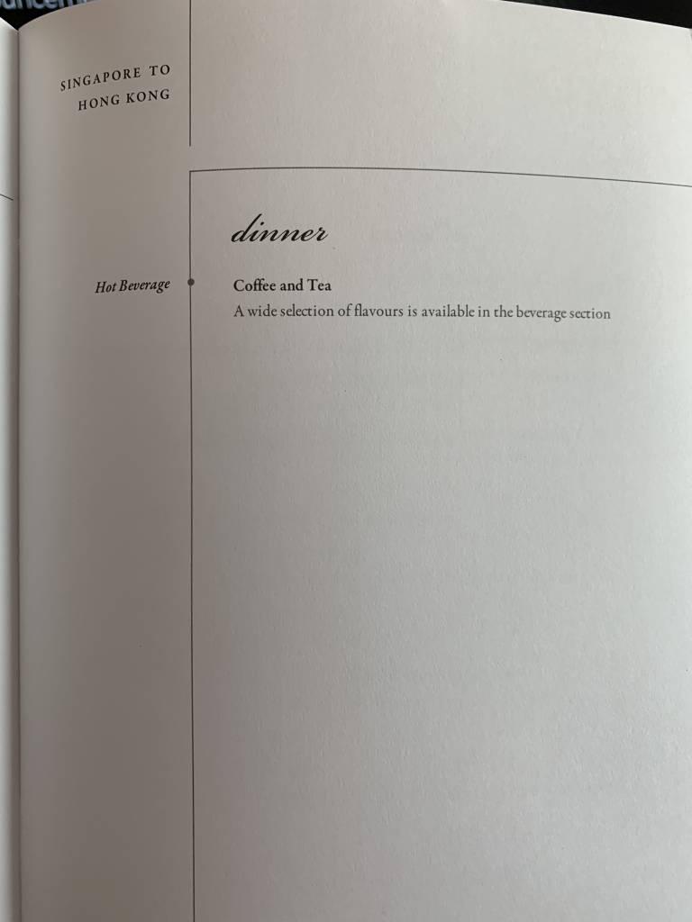 So viel vorweg: Die Getränke-Karte auf einem Singapore Airlines Flug in der Business Class reicht für viele viele Stunden. Ich trinke gerne an Board und probiere möglichst viele alkoholische Getränke. Bei Singapore Airlines könnte ich schon einen kompletten Flug damit verbringen, die Heißgetränke zu testen. Meine Favoriten bisher sind das Malzgetränk Milo, der Oolong Tea und der Kaffee Royal. Die Kaffee- und Teekarte umfasst allein vier Seiten.