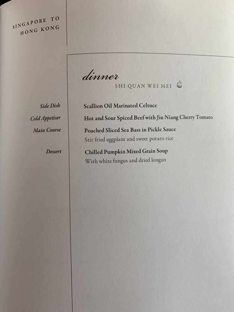 Bei einer Abflug-Zeit um 14:15 Uhr ist es bei Singapore Airlines selbstverständlich, an Board ein umfangreiches Dinner anzubieten. Besonders hervorgehoben wurde dabei das noch recht frische „Shi Quan Wei Mei“-Konzept nach chinesischem Vorbild: