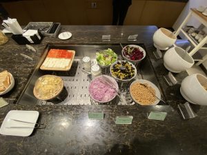 Aufgrund der fehlenden Toiletten und in der Hoffnung auf Besserung bin ich dann in die AirCanada-Lounge rüber gewechselt, das sind ja nur ein paar Meter. Die war vergleichsweise leer und meines Erachtens auch wirklich schön gestaltet. Das Essen dort ist natürlich ebenfalls keine Offenbarung, fand ich an dem Tag aber immerhin besser als bei SQ.