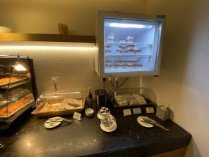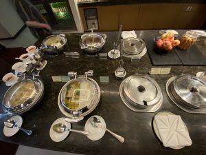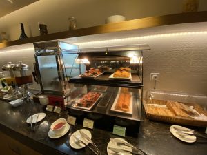 Die eigentliche Lounge ist ein einziger länglicher Raum, in dem eine Reihe unterschiedlicher Sitzgruppen stehen. Schön ist, dass hier immer wieder Steckdosen platziert sind, an denen man seine elektronischen Geräte vor dem Abflug laden kann. Im vorderen Teil der Lounge befindet sich das Buffet, an dem man sich nach Lust und Laune bedienen kann.