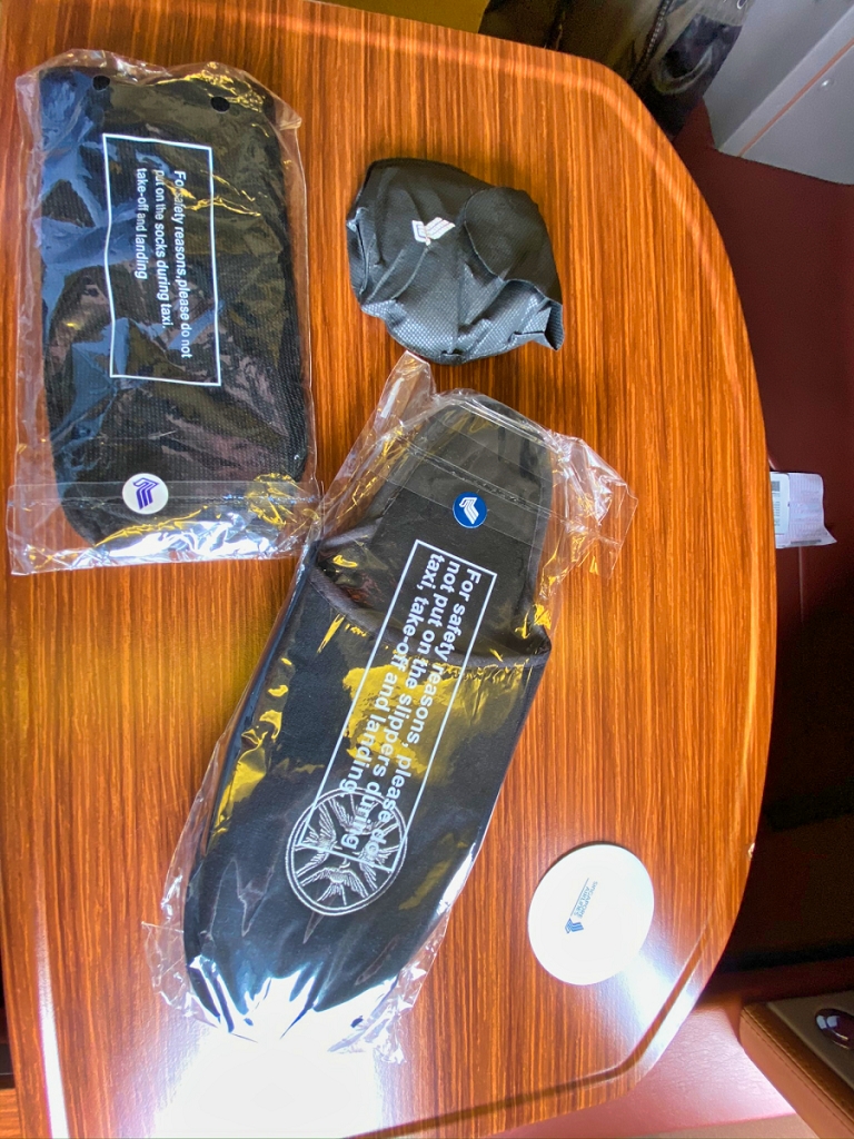 Am Platz warteten auch schon Kopfhörer (Bang & Olufsen Noise Cancelling), Kopfhörerüberzieher (zum selbst Drüberziehen), Socken und Schlappen sowie ein Lederkissen, mit abgesteppten Karos.