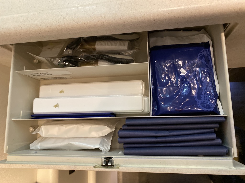 Direkt hinter dem Cockpit standen den vier First Class Gästen zwei Toiletten zur Verfügung, welche zwar nicht mit den Badezimmern von Thai, Emirates oder Etihad mithalten können, aber trotzdem für uns ausreichend waren.