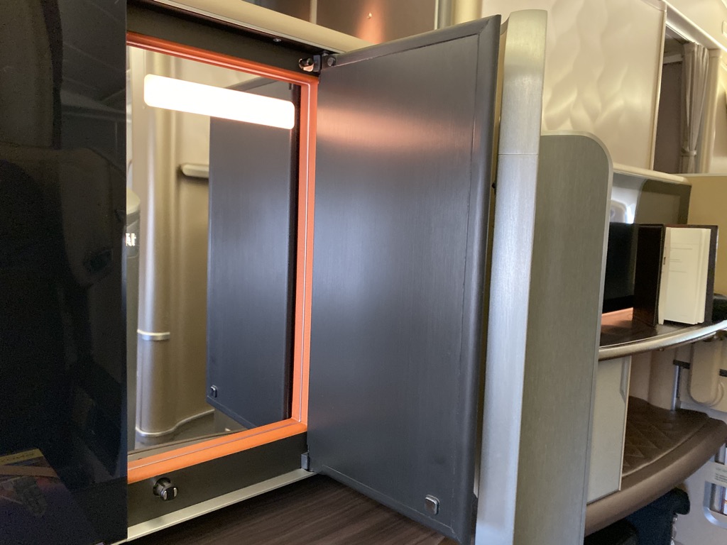 Der Sitz lässt sich natürlich auch in ein Bett verwandeln. Dies geschieht, in dem man ihn umklappt. Hinter der Lehne befindet sich auch immer noch ein weiteres Kissen – die Decken sind in einem separaten Schrank untergebracht. Wenn man jemanden von der Crew bittet, ist das Bett binnen zwei Minuten gerichtet. Aufgrund des Tagfluges haben wir diesmal verzichtet.