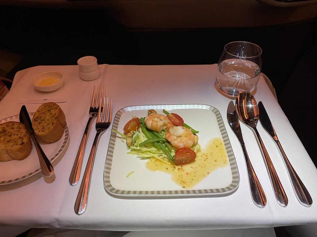 Nach dem Start begann sehr rasch auch der Service in der abgedunkelten Kabine. Zum Start gab es einen feurigen Salat mit zwei Garnelen und wieder das super leckere Knoblauchbrot, wie schon auf dem Flug nach Delhi.