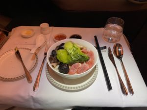 An meinem neuen Platz angekommen wurde mir ein Champagner zur Begrüßung angeboten, welcher erneut fantastisch schmeckte. Darauf folgte die Vorstellung meiner Flugbegleiterin, welche auf diesem Flug wirklich nur für mich zuständig war, da kein anderer in dem hinteren Teil der Kabine wechselte. Auch die Menükarte wurde mir in diesem Moment überreicht. Da dies ein Nachtflug war, war die Menükarte auch dem angepasst und bot „nur“ eine warme Mahlzeit nach Abflug und einen kleinen Snack zum „Frühstück“.