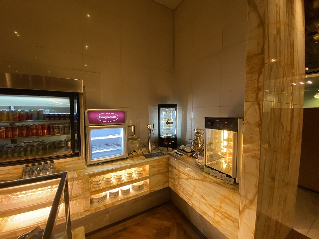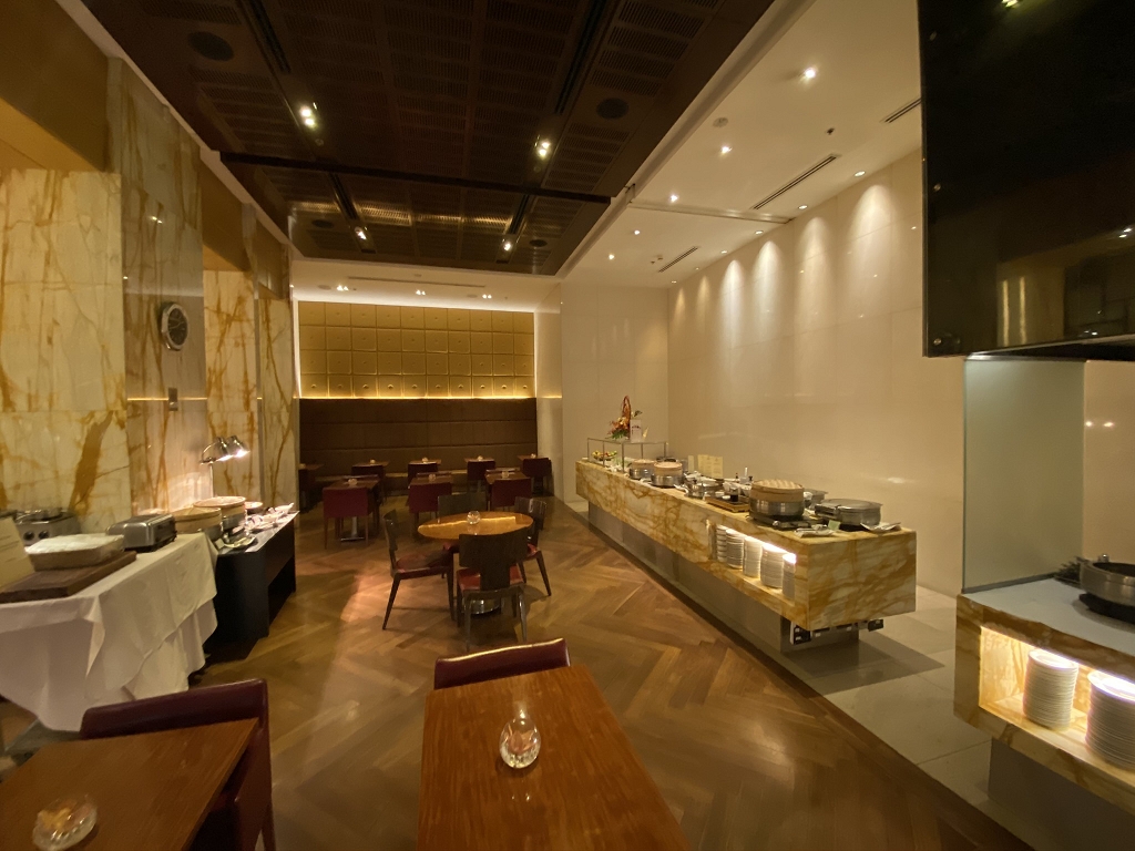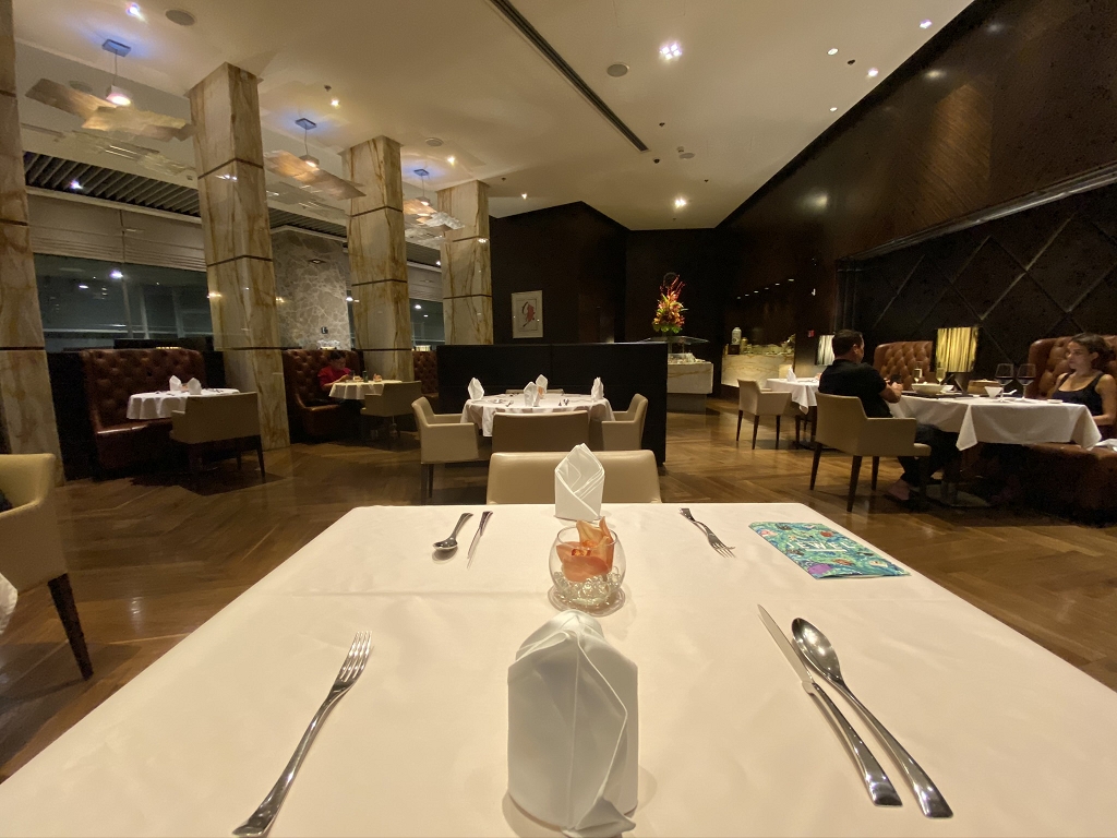 Das Herzstück der Lounge – und meiner Meinung nach die Daseinsberechtigung – ist das Restaurant. Dort nimmt man an ansehnlich gedeckten Tischen Platz und wird vom Servicepersonal dort bedient. Speisen und Getränke können aus einer umfangreichen Karte gewählt werden.