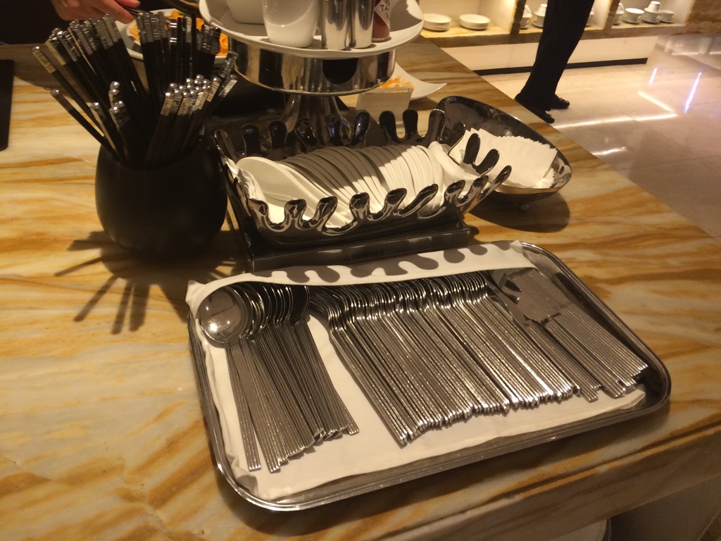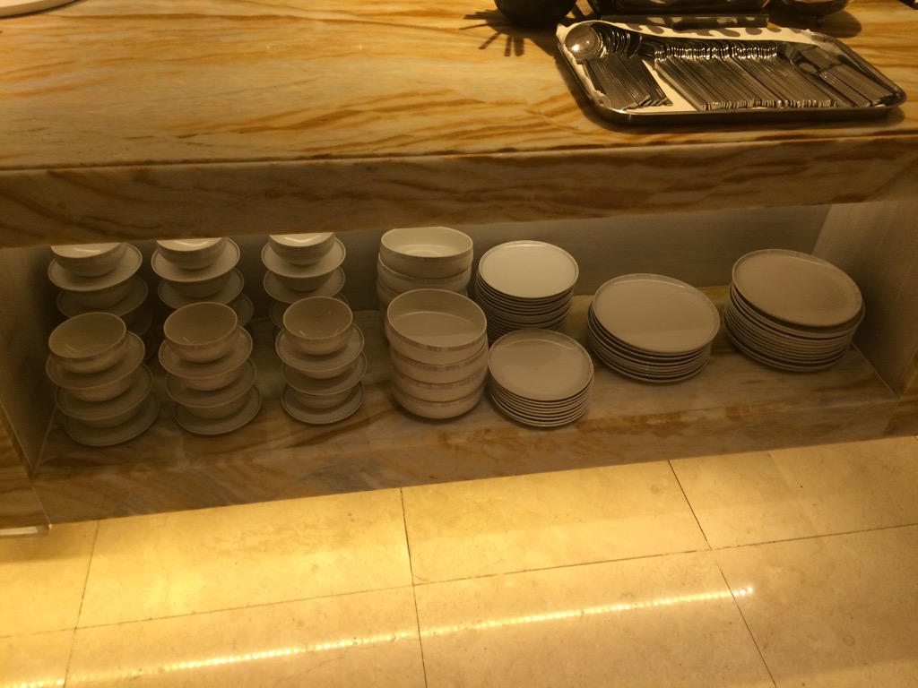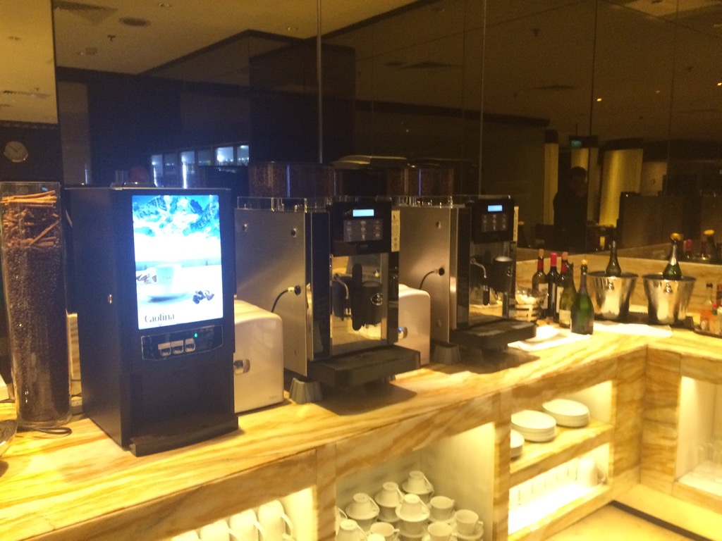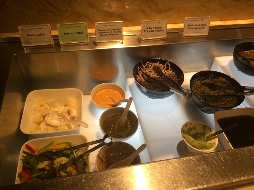 Am Buffet im vorderen Bereich der Lounge wurden Speisen und Getränke zur Selbstbedienung angeboten. Besonders das Angebot an Speisen war für eine Business Class Lounge überdurchschnittlich. So gab es neben mehreren warmen Gerichten auch Salate, Suppen, Sandwiches, Sushi, sowie Süßspeisen. Hier konnte man problemlos ein vollwertiges pre flight Dinner einnehmen.