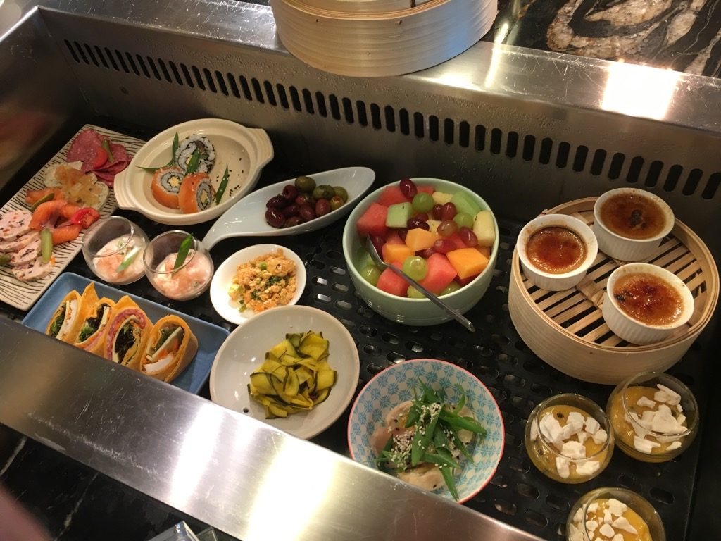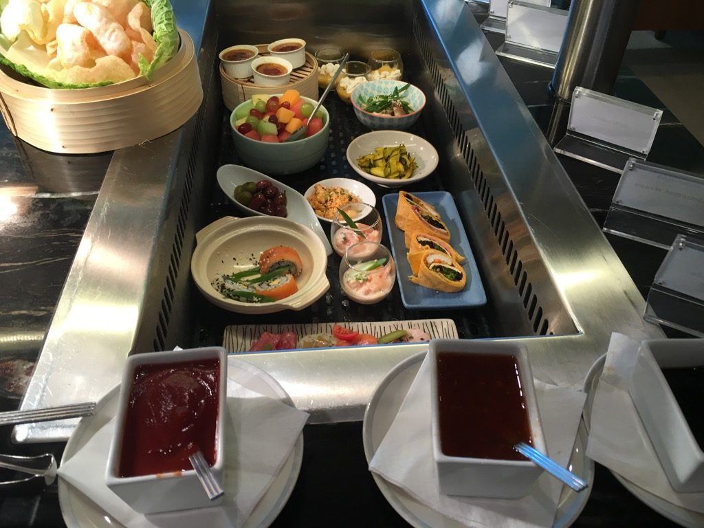 An einem kleinem Buffet wurden Speisen und Getränke zur Selbstbedienung angeboten. Besonders bei den Speisen auf dem Buffet gilt in der Singapore Airlines SilverKris Lounge Brisbane eher das Motto „Klasse statt Masse“. So gibt es eine ganze Reihe verschiedener warmer und kalter Speisen. Neben asiatischen und westlichen Optionen war das Angebot wirklich überraschend groß. Ein Koch bereitete das Essen in der Küche frisch zu und hat es sehr regelmäßig aufgefüllt. Ich lasse hier einmal die Bilder für sich sprechen.