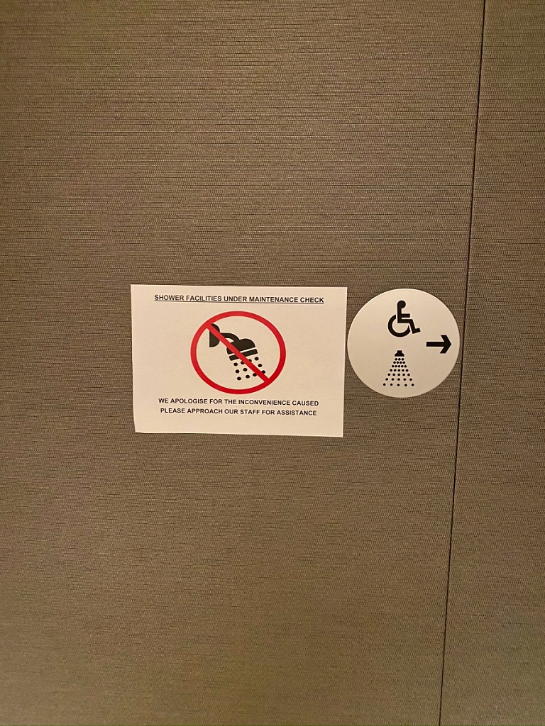 Als ich die Lounge nutzte, waren die sanitären Anlagen der Lounge seit Monaten geschlossen. Ich hatte das große Glück, dass wenigstens die WCs wiedereröffnet wurden. Dafür hatte die Klimaanlage / Dunstabzug so seine Probleme. Die Lounge roch sehr stark nach Essen. Eigentlich wollte ich dort Laksa essen, aber dieser Geruch hat mir den Appetit genommen. So gab es für mich nur ein wenig Obst, Gebäck und den unvermeidlichen Dom Perignon.