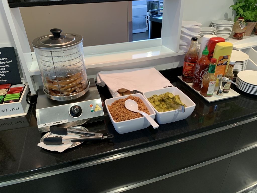 Beim Gang zum Buffet fällt direkt der Blick auf einen bereitgestellten Servierwagen auf, auf dem per Schild dazu aufgefordert wird, gebrauchtes Geschirr und leere Getränkebehälter hier abzustellen. Normalerweise lässt das schon große Schlüsse auf die Sauberkeit in einer Lounge zu. Zur Sky Lounge passt dieser Rückschluss allerdings nicht, denn es war kontinuierlich mindestens eine Service-Kraft vor Ort, die Teller und Gläser abgeräumt hat.