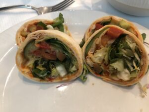 Als kalte Speisen werden Obst, Wraps, Salat, Joghurt und Kuchen angeboten.