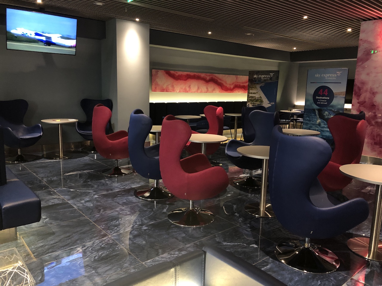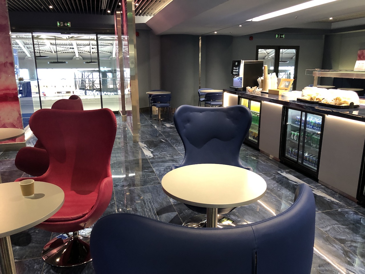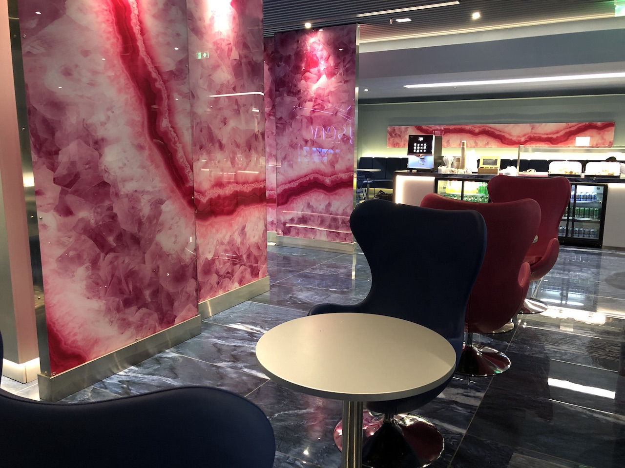 Die Lounge ist relativ klein und überschaubar, zum Zeitpunkt der Review waren kaum Gäste anwesend. Das Interieur wirkt sehr neu und modern, Farben und Design sind Geschmacksache. Die intensiven Rot- und Blautöne dominieren.