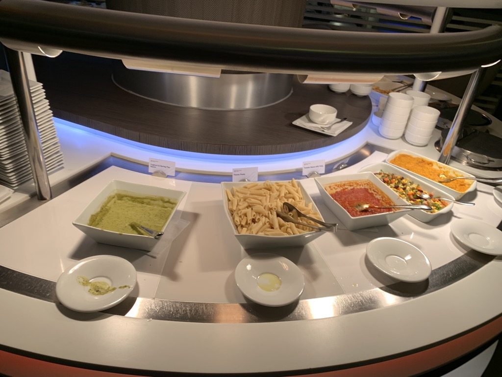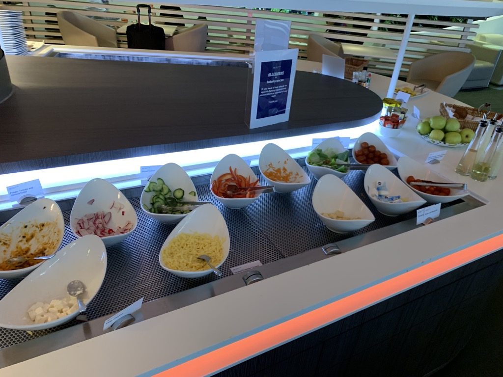 Zentraler Bestanteil der SkyTeam Lounge war in jedem der beiden Stockwerke eine große Buffetinsel, auf welcher eine überraschend große Auswahl an Speisen angeboten wurde.