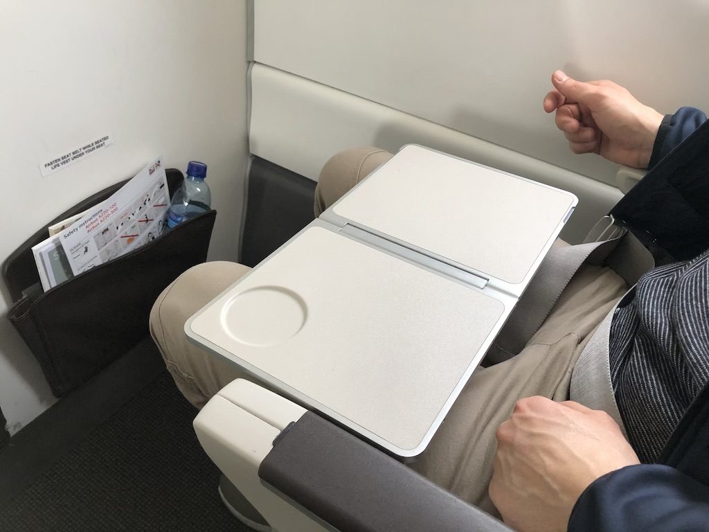 Unsere Plätze waren 1D & 1F, die Beinfreiheit dort ist etwas begrenzt. Die Tische der vorderen Reihe sind in den Armlehnen und befinden sich im ausgeklappten Zustand ziemlich nah am Gast. Ab der zweiten Reihe sind diese an einer Stange angebracht, jedoch etwas klein geraten. Gut, dass man den Tisch des freien Nachbarplatzes beispielsweise für Getränke nutzen kann, denn die Tische sind eine wackelige Angelegenheit.