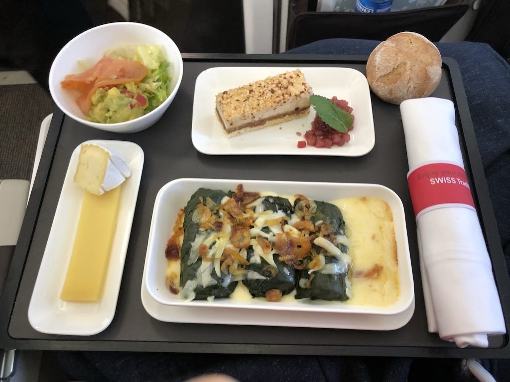 Das Tablett kam mit einer kleinen Vorspeise, Käse und einer äußerst leckeren Haselnusscremeschnitte. Als Hauptgang habe ich mich für vegetarisch gefüllte Weinblätter entschieden, diese waren mit Mandelsplitter und Käse überbacken. Alternativ gab es ein Rindsfilet, mein Reisepartner war begeistert! Dazu wurden warme Brötchen gereicht. Zum Hauptgang wurden nochmal Getränke angeboten.