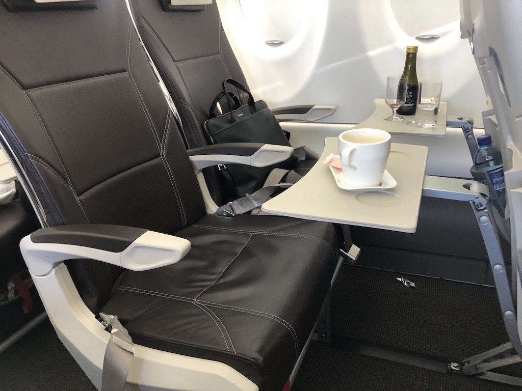 Herzlich wurden wir von der Crew an Bord begrüsst. Die Anordnung der Sitze ist 2-3 und bietet in der Business Class einen freien Nachbarsitz. Das Flugzeug ist kein großer Airbus und man muss hier und da aufpassen dass man nicht an die Decke stößt. Der Platz für Handgepäck ist in der ersten Reihe limitiert, die Deckenfächer sind aber riesig. Durch die geblockten Sitze gibt es in den anderen Reihen zusätzlichen Stauraum. Die Sitze wirken sehr edel und hochwertig, das Design ist insgesamt ansprechend.