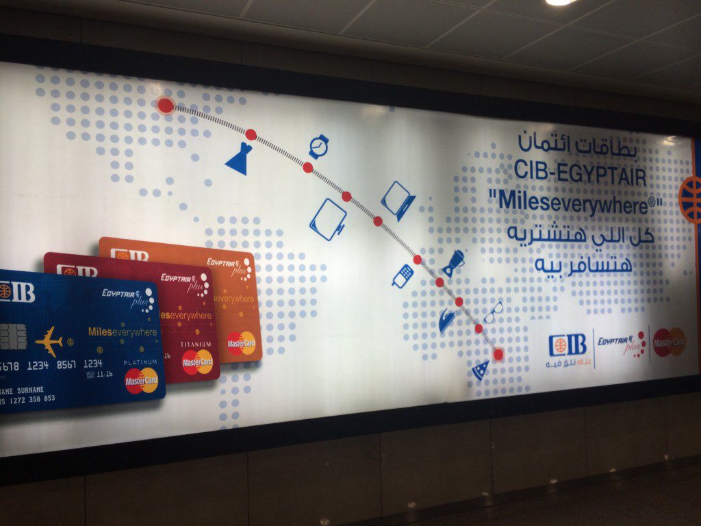 Vor unserem Abflug haben wir noch einige Minuten in der Egyptair Lounge in unmittelbarer Nähe zum Gate verbracht, bevor wir uns auf den Weg zum Gate F2 gemacht haben. Auf dem Weg ist mir die große Werbung für eine ägyptische Kreditkarte zum Meilensammeln aufgefallen. Dies scheint auch in Ägypten inzwischen ein Thema zu sein.