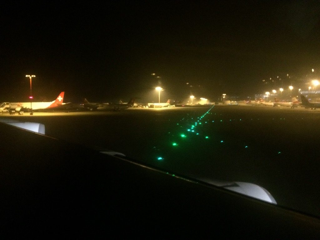 Kurz nachdem ich mich auf meinem Platz eingerichtet habe, wurde mir von einer Flugbegleiterin mein Mantel abgenommen und ein Willkommensgetränk serviert. Dabei hatte man von einem Tablett die Auswahl zwischen Wasser, Orangensaft und Champanger. Kurze Zeit später sind wir pünktlich in das nächtliche Zürich gestartet.
