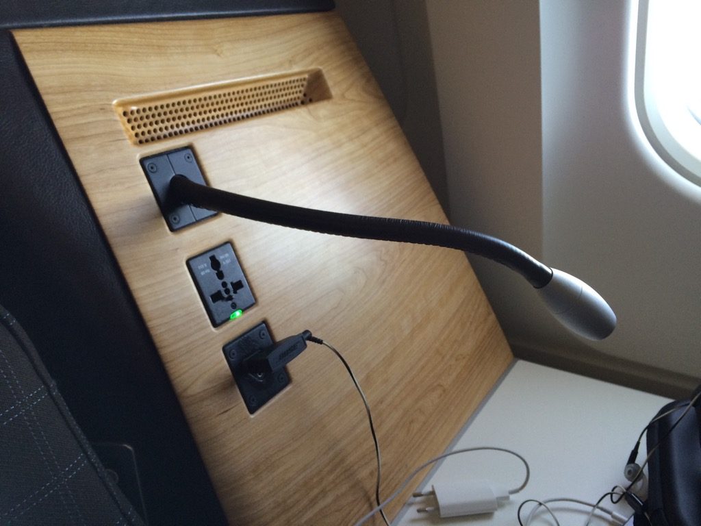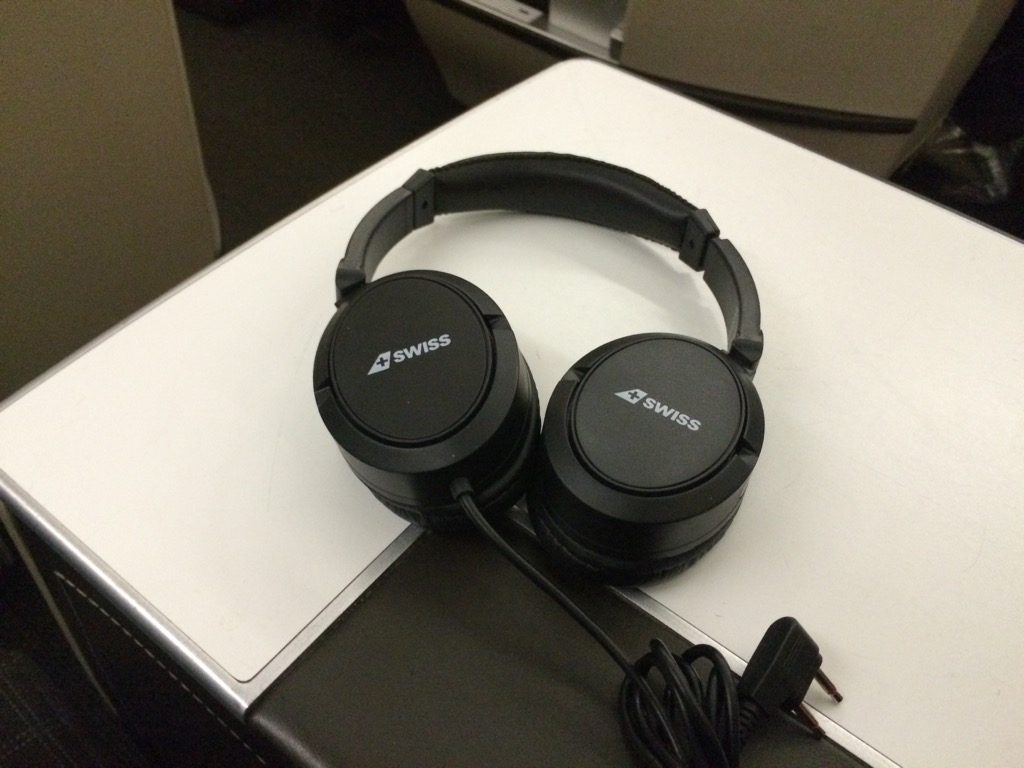 Swiss bietet in der Business Class „noise cancelling headphones“ an. Diese sind soweit auch in Ordnung, allerdings bevorzuge ich meine Bose QuietComfort 35, welche deutlich angenehmer zu tragen sind und eine fantastische Tonqualität haben. Der Steckplatz für die Kopfhörer ist günstig über der Armlehne angebracht. Hier befindet sich auch die 110V Steckdose und die Leselampe.