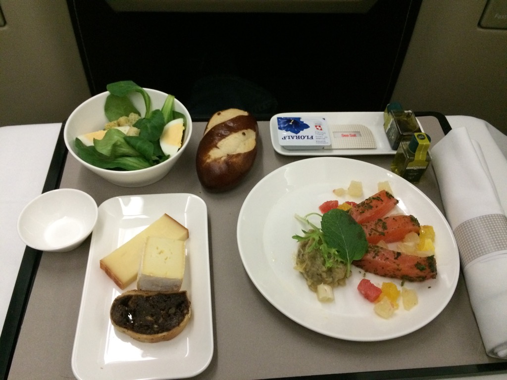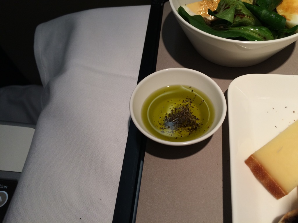 Der Lachs mit Auberginenmousse war sehr gut und nach meinem Geschmack. Wo Swiss noch nachbessern kann ist an der Butter und den Salz- und Pfeffer Tüten. Dies ist in der Business Class unpassend. Positiv und wertig empfand ich dagegen das Angebot von Olivenöl zum Brot.