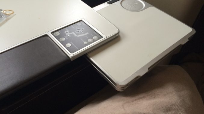 Eine Besonderheit des Swiss Business Class Sitzes ist der Tisch, welcher auf Knopfdruck aus der Armlehne ausklappt. Der Tisch selbst ist recht stabil und angenehm groß, das Ausklappen ist auch selten ein Problem, beim wiedereinklappend muss man allerdings erst einmal wissen wie es geht. Es gibt hier auf dem Gelenk Pfeile, welche in eine Linie gebracht werden können, damit man ihn einklappen kann. Ich bin Ingenieur und finde diese Mechanik sehr unpraktisch! Daher hat man dies in der Business Class in der Boeing 777-300er wohl auch überarbeitet.