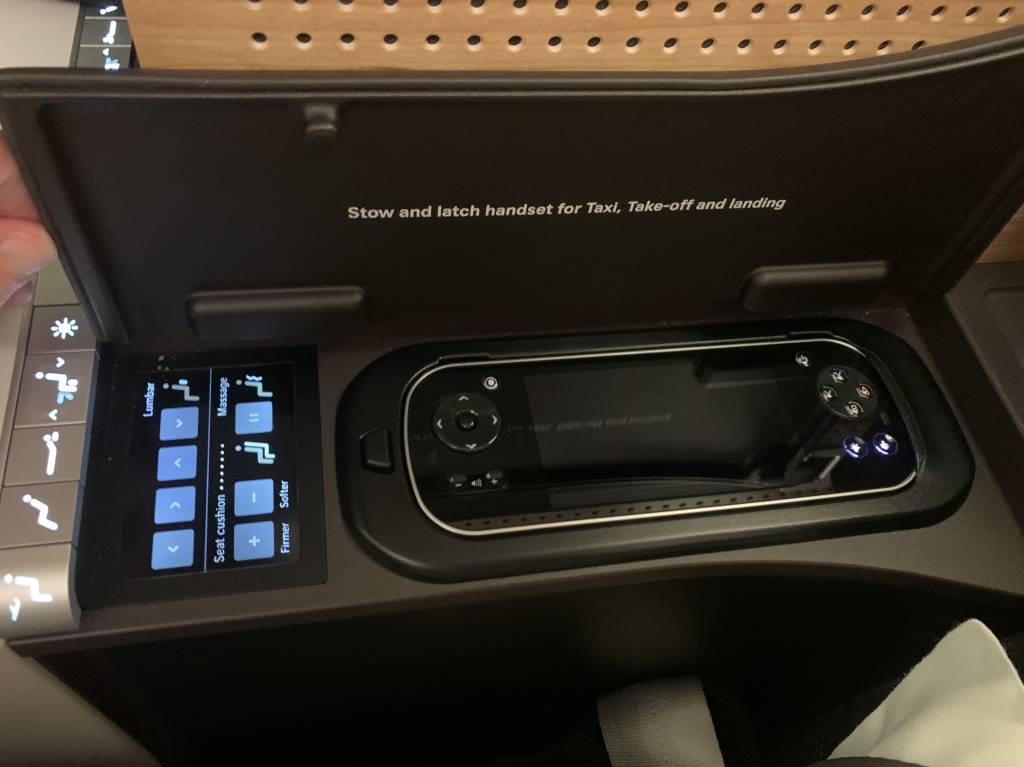 Unter dem Bildschirm befindet sich ein kleines Ablagefach. Groß genug für Dokumente, Mobiltelefone oder auch ein Notebook. In der Reihe 4 gab es daneben auch noch ein Klappfach und darunter noch ein extra Stauraum, in dem man gut Schuhe verstauen kann. Weitere Ablagemöglichkeiten befinden sich in der Mittelkonsole zwischen den beiden Sitzen.