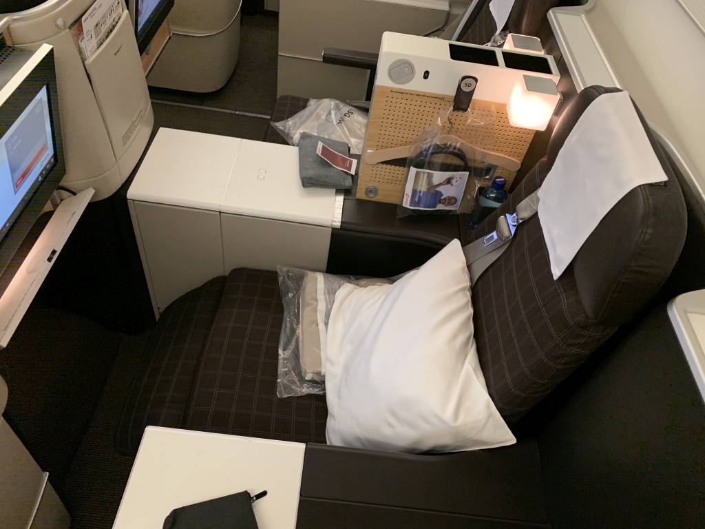 Diesmal entschieden wir uns für die Sitze 5A und 5B. Das sind die Plätze in der hinteren Reihe des Stübli. Leider bemerkte ich mitten im Flug, dass mein Sitz sich nicht verstellen ließ und musste von 5A auf 5D wechseln. Richtig schlafen oder auch nur gut sitzen, konnte ich dort nicht. Das lag vermutlich aber weniger am Sitz als an mir.