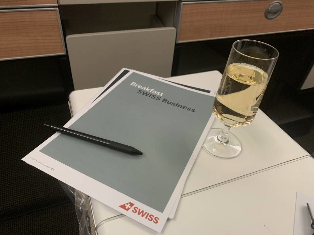 Wie schon zuvor, wurden wir mit dem obligatorischen Gläschen Champagner als Pre-Departure-Drink begrüßt. Und auch die Speisekarten inklusive des Bestellformulars für das Frühstück lagen schon am Platz.