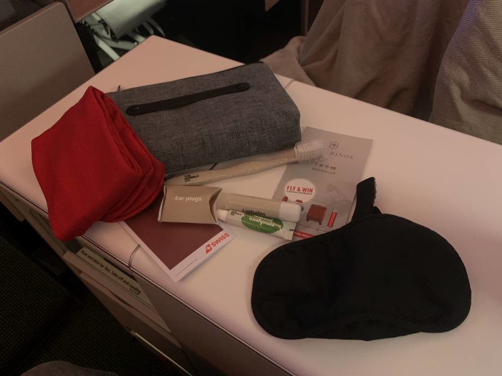 Zusätzlich wartet am Platz ein Amenity Kit mit wirklich nur Basic-Utensilien. Dazu gehören Zahnbürste, Zahnpasta, Socken, Schlafmaske, Lippenbalsam und Ohrstöpsel. Die Tasche, in der sich die Amenities befinden ist von der Schweizer Firma Victorinox. Ich schrieb es auf der Review des Hinflugs schon mal: Grüezi Victorinox, überdenkt diese Kooperation doch noch mal, denn in meinen Augen schadet sie eurer Marke.
