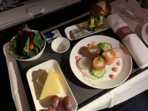 Direkt nach dem Start sollte noch ein vollständiges Dinner serviert werden. Wir waren gespannt, denn während auf dem Flug nach Hongkong ein Restaurant aus dem Kanton Graubünden Pate für das Catering stand, wurde es diesmal von einem Hotel aus Hongkong zusammengestellt. Ich war gespannt auf den Vergleich.