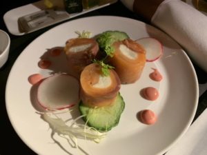 Als Vorspeise wurde ein Tablet serviert, welches aus einem Garten-Salat und einem kleinen Käse-Teller, sowie eine Vorspeise nach Wahl bestand. Wir entschieden uns für die Lachsröllchen gefüllt mit Frischkäse und Spargel eingerollt in Roastbeef. Die beiden Vorspeisen waren hervorragend.