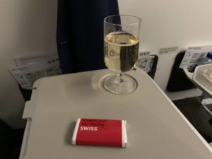 Nur wenige Sekunden nach dem Sandwich wurde uns dann auch aktiv Champagner angeboten. Das konnten wir natürlich nicht ausschlagen. Serviert wurde der bei Swiss etablierte Duval Leroy Champagner. Ehe das Glas vollständig geleert war, wurde das Glas auch schon wieder aufgefüllt.