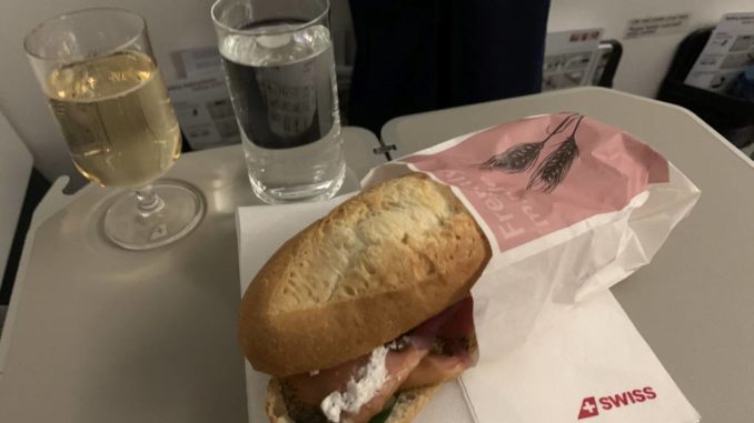 Daher wurde uns schon vor dem Abflug eine Flasche Wasser und ein Erfrischungstuch ausgehändigt. Während des Fluges wurde dann ein in einer Papiertüte verpacktes Sandwich mit Lachs, Frischkäse und Zwiebeln verteilt. Das Sandwich war lecker und könnte Lufthansa gut als Vorbild für ein „wertiges Sandwich“ dienen.