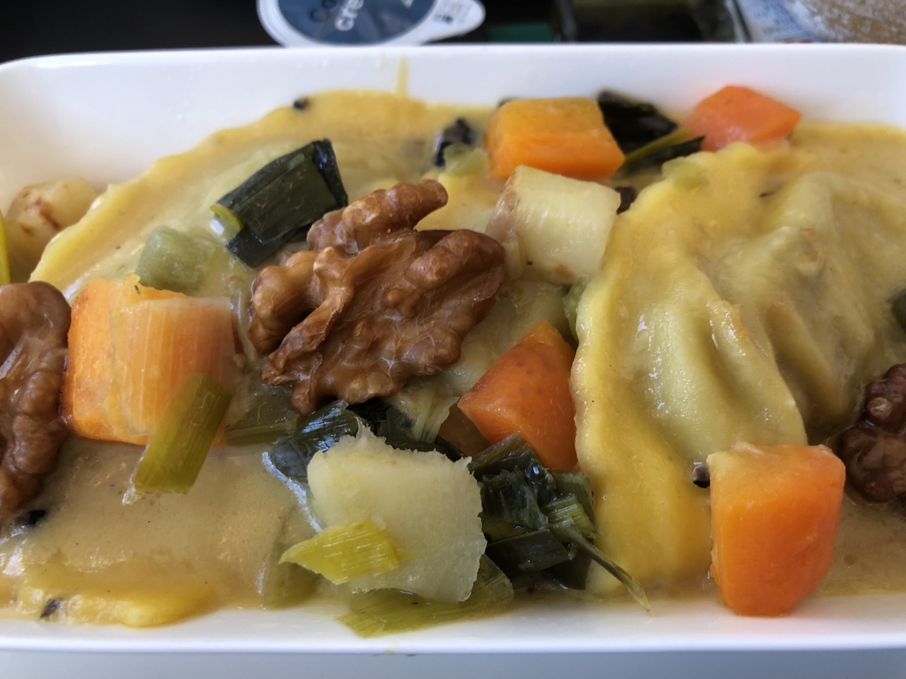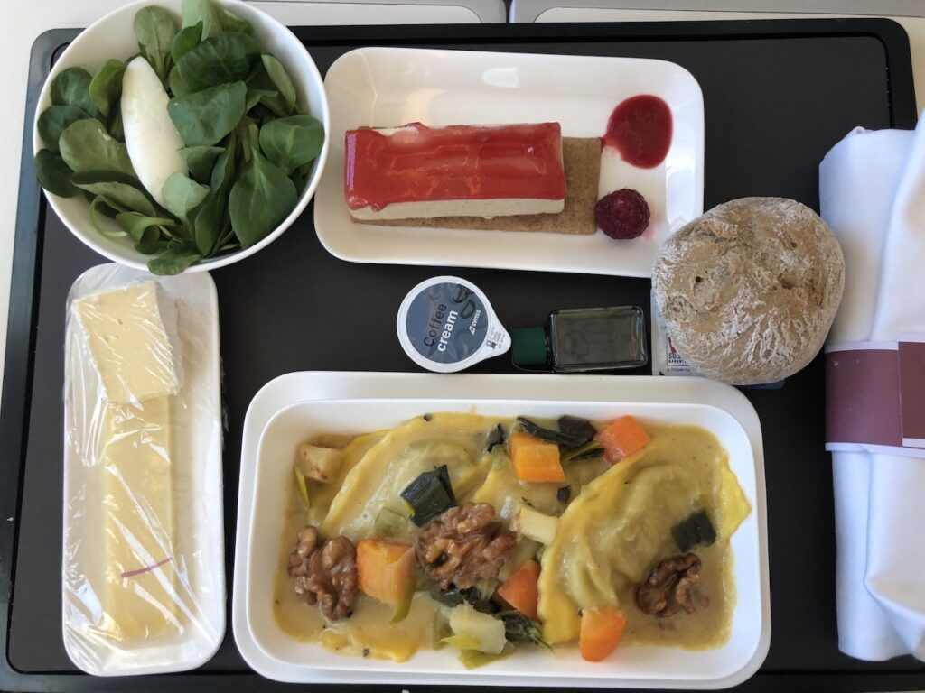 Ich war in den letzten zwei Jahren häufig in Griechenland und habe festgestellt, dass es bei gewissen Urlaubsdestinationen gar keine warmen Hauptgänge in der Business Class gibt. Bei dem fast dreistündigen Flug nach Heraklion war es heute aber anders, es wurden sogar zwei verschiedene Optionen angeboten. Darunter ein wirklich leckeres vegetarisches Pastagericht. Dazu kam Brot aus dem Korb, die Gläser wurden erneut aufgefüllt.