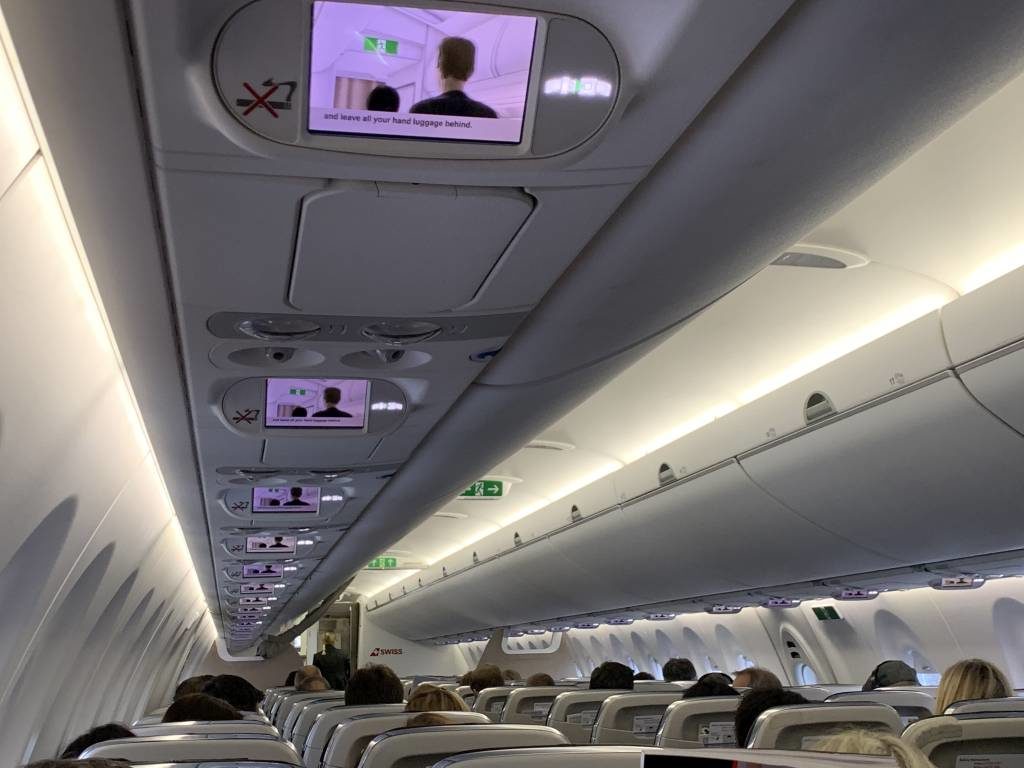Die gesamte Kabine wirkt sehr modern und noch wenig verschlissen. Aber wen wundert es, denn die Airbus A220 sind erst seit Sommer 2016 in der Swiss Flotte. Über den Sitzen hängen kleine Bildschirme, auf denen auch das Sicherheitsvideo präsentiert wird.