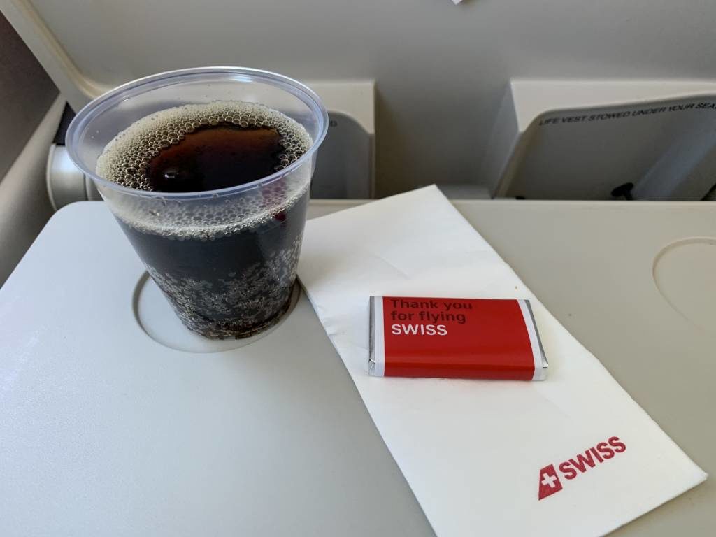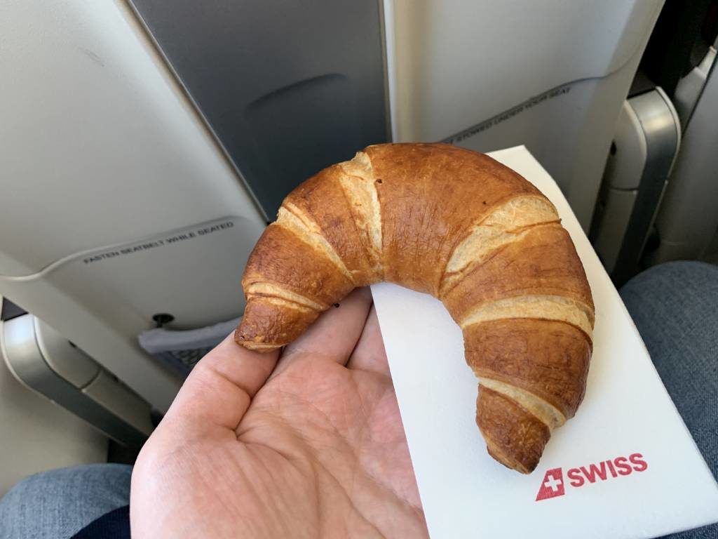 Die Swiss gehört zu den Premium-Marken der Lufthansa Gruppe. Und so gibt es an Board natürlich auch einen kostenlosen Service. Bereits kurz nach dem Start verteilte die Crew ein leckeres Schweizer Gipfeli. Der Getränkeservice wurde dann im Anschluss durchgeführt. Neben Heißgetränken, wie Kaffee und Tee, wurden auch diverse Kaltgetränke angeboten. Ich wählte etwas frevelhaft eine Cola zu meinem Croissant.