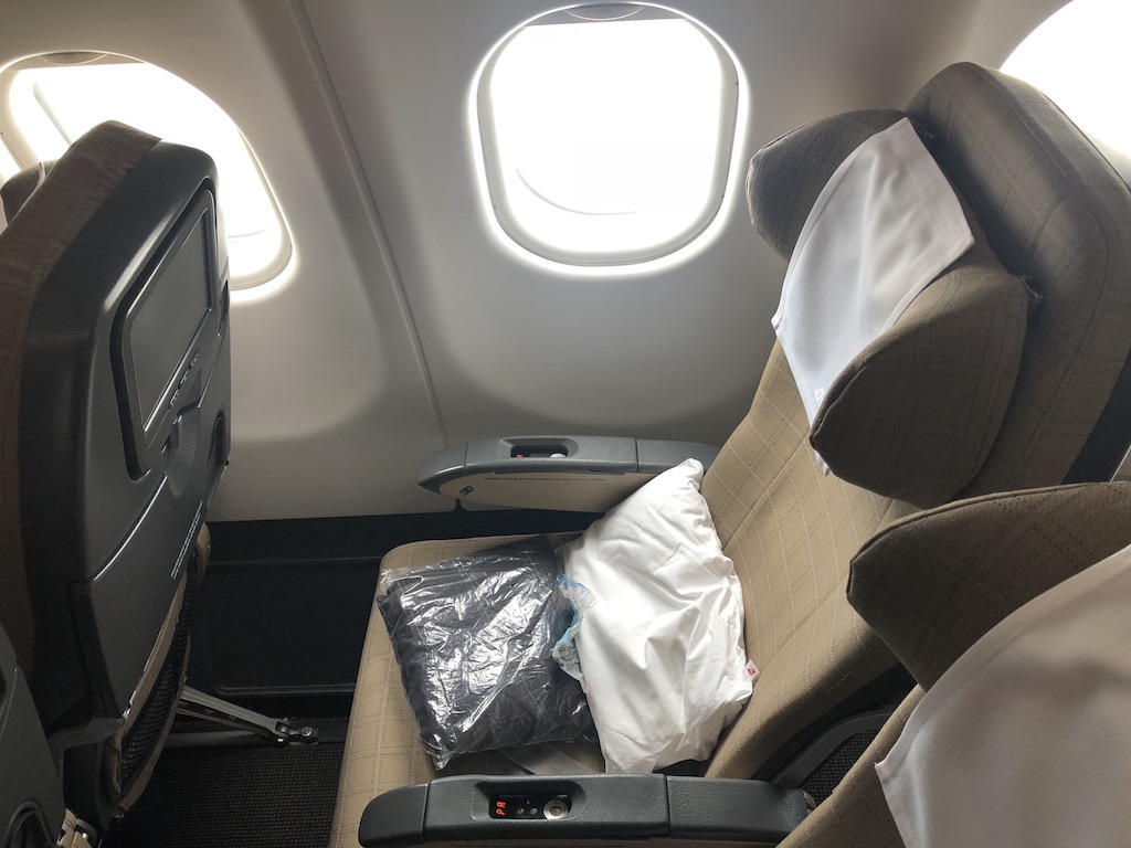 Für meinen Flug konnte ich beim Online-Check-In kostenfrei einen Sitzplatz in der Notausgangsreihe am Fenster (Seat 29K) auswählen. Dieser verfügt über ein sehr großes Platzangebot im Fußraum. Jedoch wird hier in meinen Augen der Sitzkomfort etwas durch die in der Tür installierte Evakuierungsrutsche beeinträchtigt. Da mein Nebensitz leider belegt war, im hinteren Teil jedoch zahlreiche freie Sitzplätze zur Verfügung standen, entschied ich mich, auf einen „normalen“ Sitzplatz am Fenster zu wechseln, um hier die Vorzüge des freien Nebensitzes zu genießen. Der Sitzabstand war hier für eine Langstreckenbestuhlung völlig in Ordnung.
