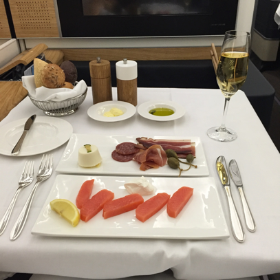 Nach dem Start wurde mit dem Bordservice begonnen. Vorspeisen und Dessert werden jeweils von einem Servierwagen aus serviert, die Hauptspeisen werden in der Küche zubereitet. Mir gefällt es sehr gut, dass es möglich ist mit seinem Reisepartner zusammen am Tisch zu essen. Der Tisch ist groß genug und bietet Platz für beide. Der Ottomane ist ebenfalls bequem zum Sitzen und man hat sogar die Möglichkeit sich anzuschnallen.