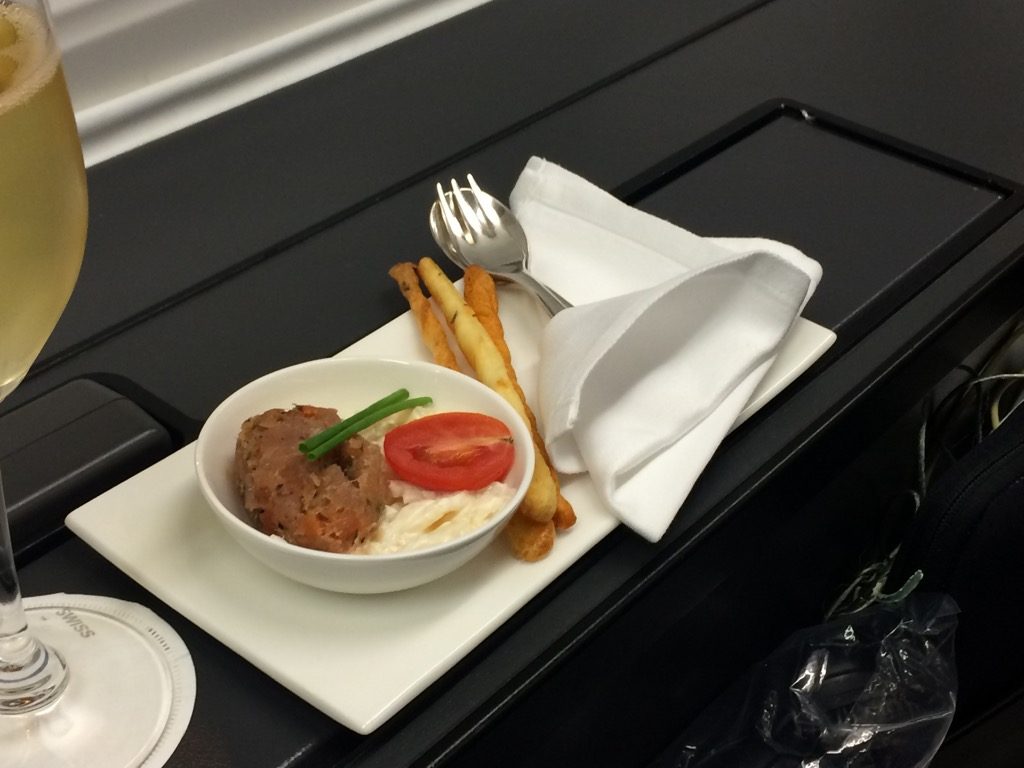 Der Champagner und das Wasser mit Eis wurde prompt wie bestellt geliefert und auch vor dem Start noch mehrmals aufgefüllt. Swiss serviert noch am Boden ein kleines amuse bouche. In diesem Fall ein Rindertatar mit Kartoffelsalat und warmen Sprüngli Knuspersticks. Auch wenn es mich nicht begeistert hat, war es durchaus gut.