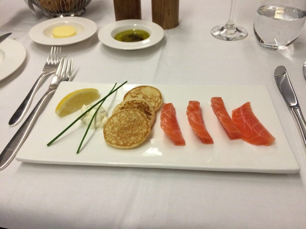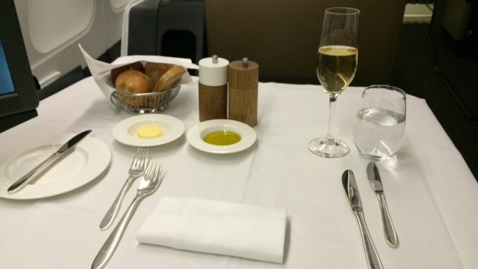 Die Details, wie die großen Salz und Pfeffer Streuer, Brotkorb, Butter und Olivenöl runden das Bild ab. Bei einem Glas Champagner wartete ich auf meine Vorspeise. Die Essensbestellung habe ich bereits vor dem Start aufgegeben.