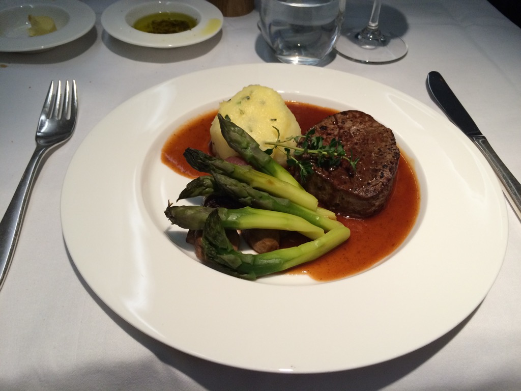 Als Hauptgang habe ich das Rinderfilet mit Rotweinsauce, Kartoffelpüree und grünem Spargel bestellt.