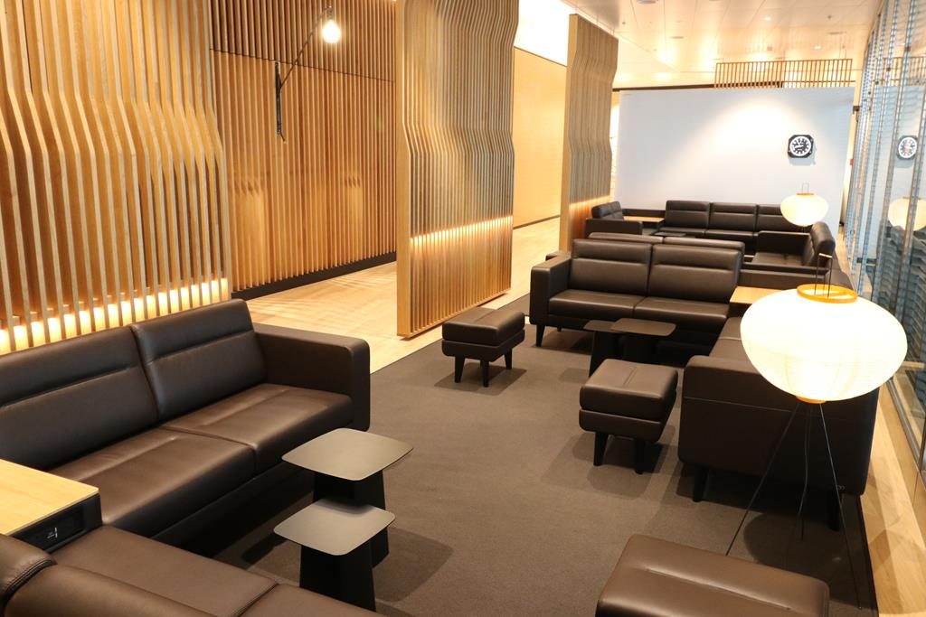 Die Swiss First Class Area befand sich im Erdgeschoss der Business Lounge, in einem abgetrennten Bereich und war mit einigen Tischen und den Couchmöbeln in Swiss-Optik ausgestattet. Schön finde ich bei Swiss immer, dass vor allem an den Couches diverse Möglichkeiten verbaut sind, seine elektrischen Geräte zu laden. So gibt es überall gut erreichbar Steckdosen und USB-Anschlüsse.