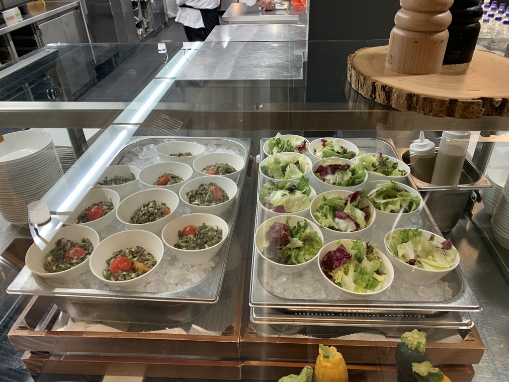 Im hinteren Bereich der Lounge war eine kleine Bar aufgebaut, an der allerlei ungekühlte Getränke standen, aber leider keine Gläser. Limonade und Cola kann man noch recht gut aus der Flasche trinken, bei 1L Wasser oder Wein wird das schon schwieriger. Es schien auch ein Platz für die Gläser vorgesehen zu sein, leider wurden sie erst am Ende unseres fast zweistündigen Aufenthaltes aufgefüllt. Auch das Geschirr, was teils noch von den vorherigen Gästen an den Couchtischen stand, haben wir selbst zur Seite geräumt. Während unseres Aufenthaltes wurde einmal benutztes Geschirr eingesammelt – das ist definitiv zu selten.